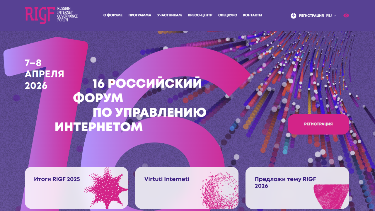 Шестнадцатый российский форум по управлению интернетом состоится 7–8 апреля 2026 г. в Москве.